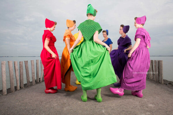 Een kleurrijke dans van modellen in de moderne Walcherse dracht in de zeven kleuren van de regenboog