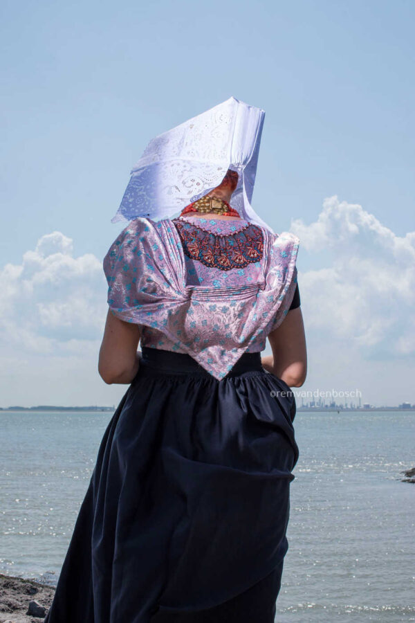 Een vrolijk en traditioneel beeld van een model in katholieke Zuid-Bevelandse dracht in een kustgebied, met een sterke band met de natuur.
