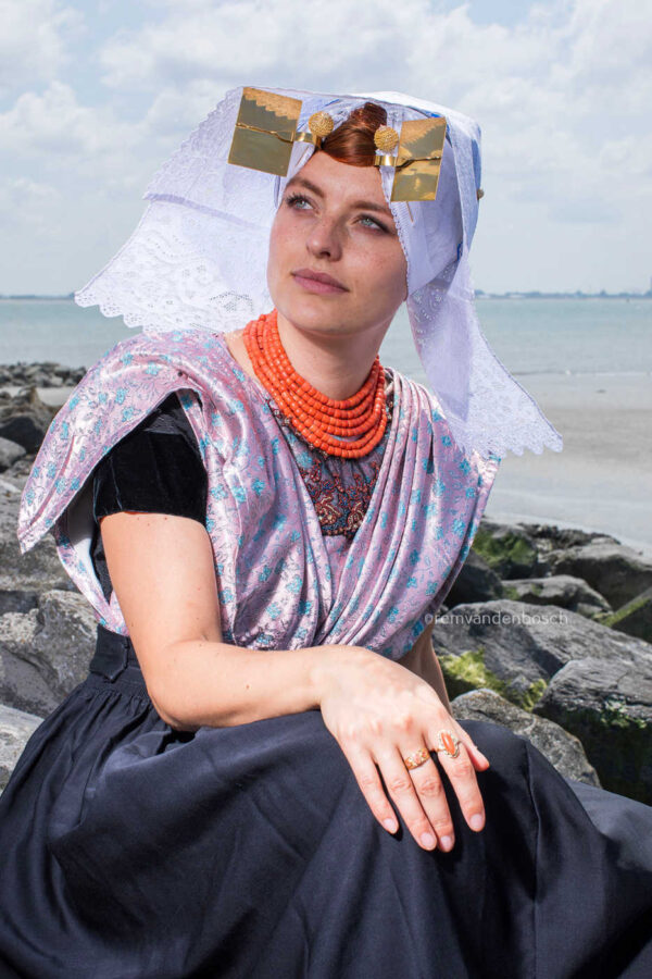 Dit prachtige beeld van Rem van den Bosch toont een model in traditionele katholieke Zuid-Bevelandse dracht, gefotografeerd tegen de achtergrond van een rotsachtige kust. De vrolijke kleuren en de natuurlijke setting creëren een energieke uitstraling, die de kijker uitnodigt om het ritme van de natuur te voelen.